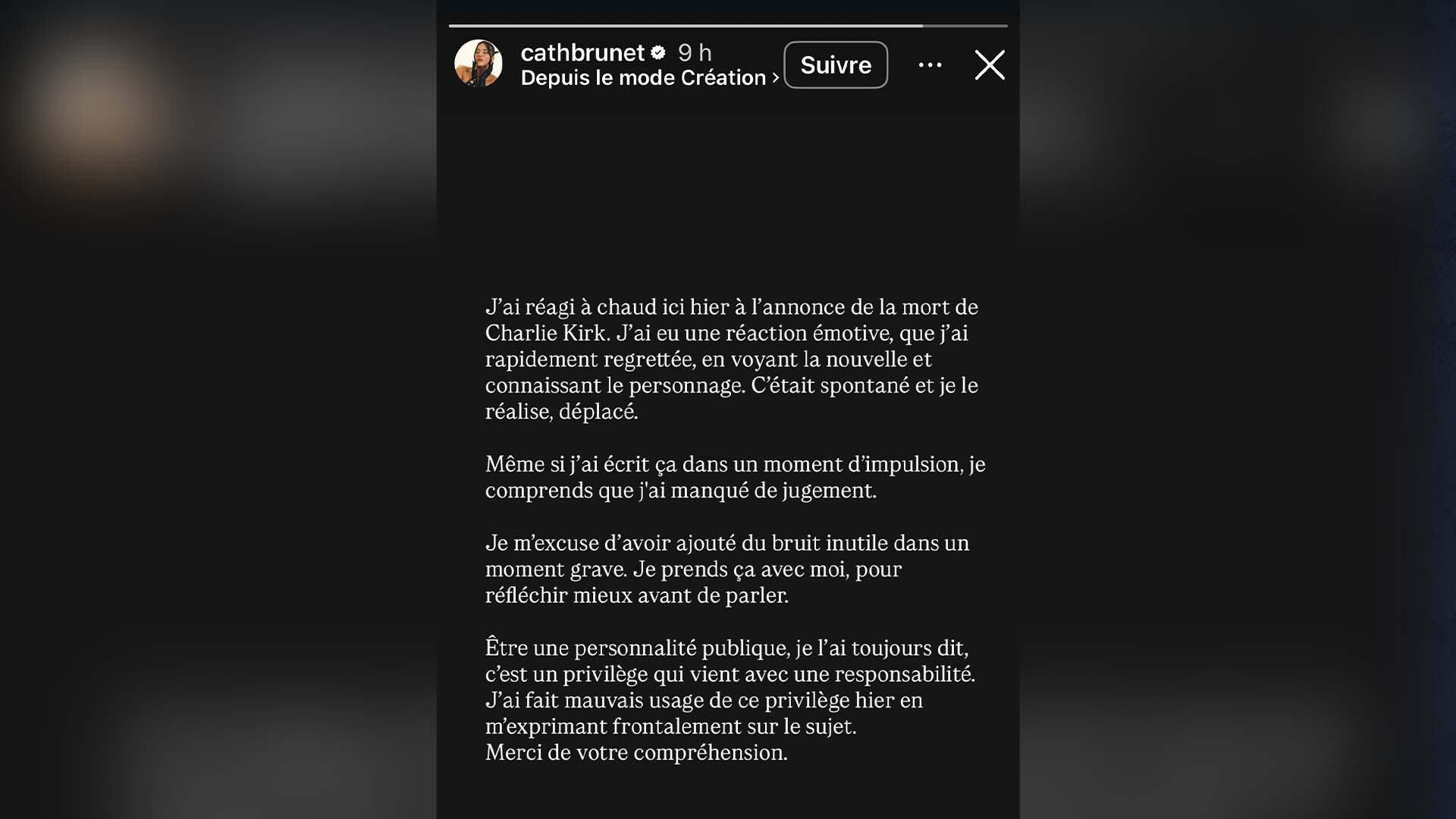 La comédienne Catherine Brunet a présenté des excuses jeudi après avoir «réagi à chaud» à la mort de l’influenceur conservateur Charlie Kirk mercredi.