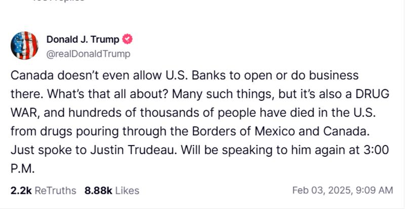 Dans une publication sur son réseau Truth Social, M. Trump affirme que le «le Canada n’autorise même pas les banques américaines à y ouvrir ou à y faire des affaires.» Le président américain évoque aussi la guerre à la drogue qui a tué des «centaines de milliers de personnes aux États-Unis» et confirme que lui et Justin Trudeau se parleront à nouveau à 15 h 00.