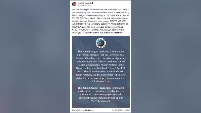 Dans un message publié jeudi soir sur Truth Social, il a soutenu que la Fondation Ronald Reagan avait accusé le Canada d’avoir utilisé frauduleusement une fausse publicité montrant l’ancien président, aujourd’hui décédé, critiquant les droits de douane.