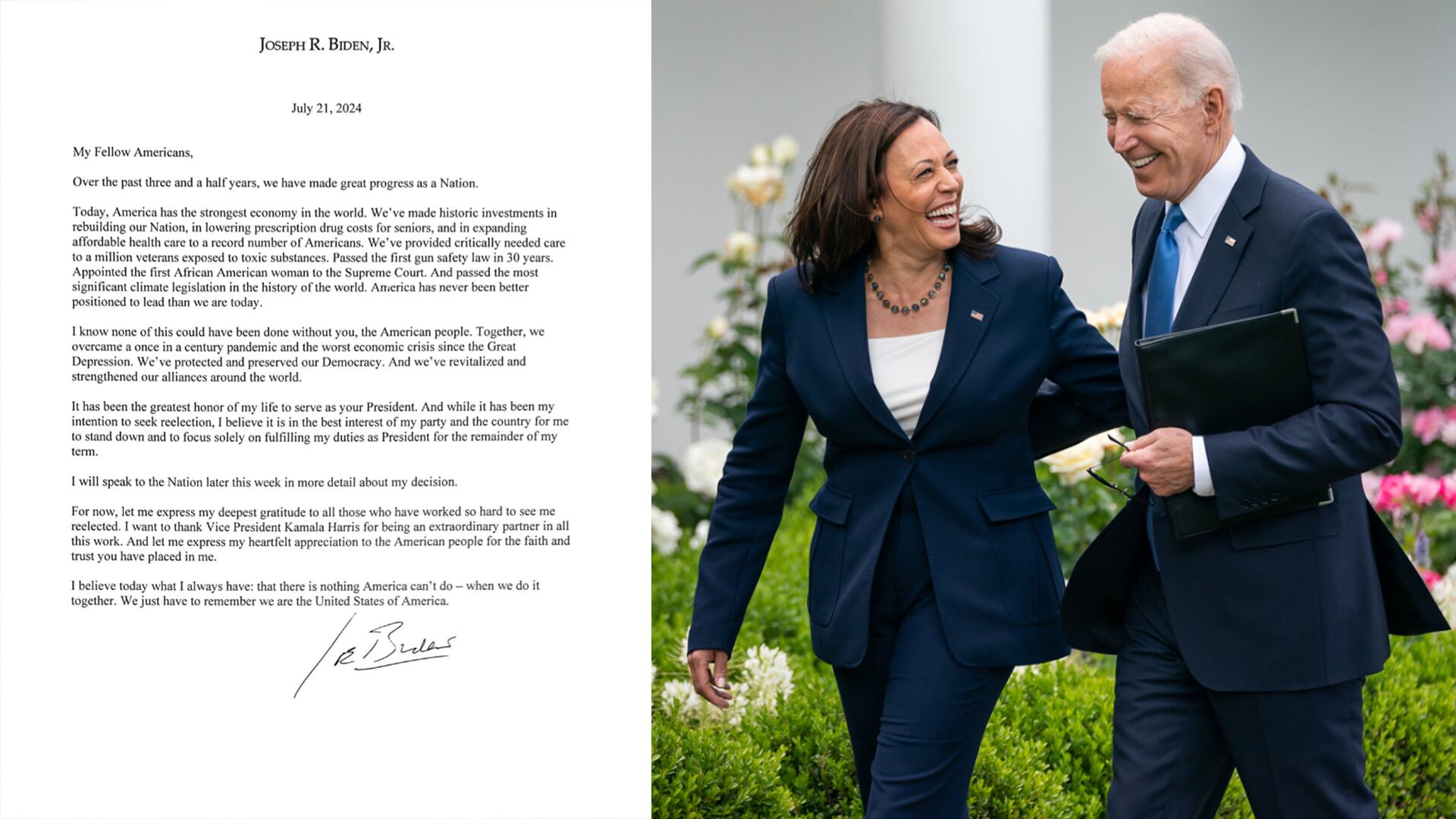 Pour l'heure, permettez-moi d'exprimer ma profonde gratitude à tous ceux qui ont travaillé d'arrache-pied pour me voir réélu. Je tiens à remercier la vice-présidente Kamala Harris pour avoir été une partenaire extraordinaire dans tout ce travail. Et permettez-moi d'exprimer ma sincère gratitude au peuple américain pour la foi et la confiance qu'il a placées en moi.