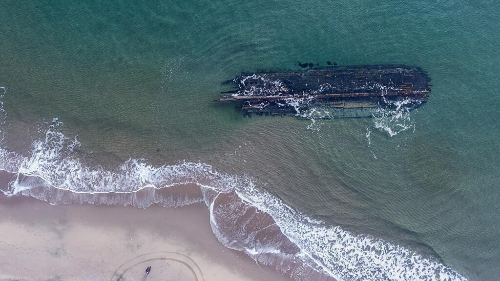 L'épave a été remarquée pour la première fois par un chasseur de la région, qui a repéré une longue ombre sombre dans l'eau juste à côté de la plage de sable. Les experts et les habitants ont émis l’hypothèse qu’elle aurait pu être libérée des sols marins par la tempête post-tropicale Fiona de 2022, qui a détruit environ 100 maisons et creusé de vastes étendues de rivage dans la région.